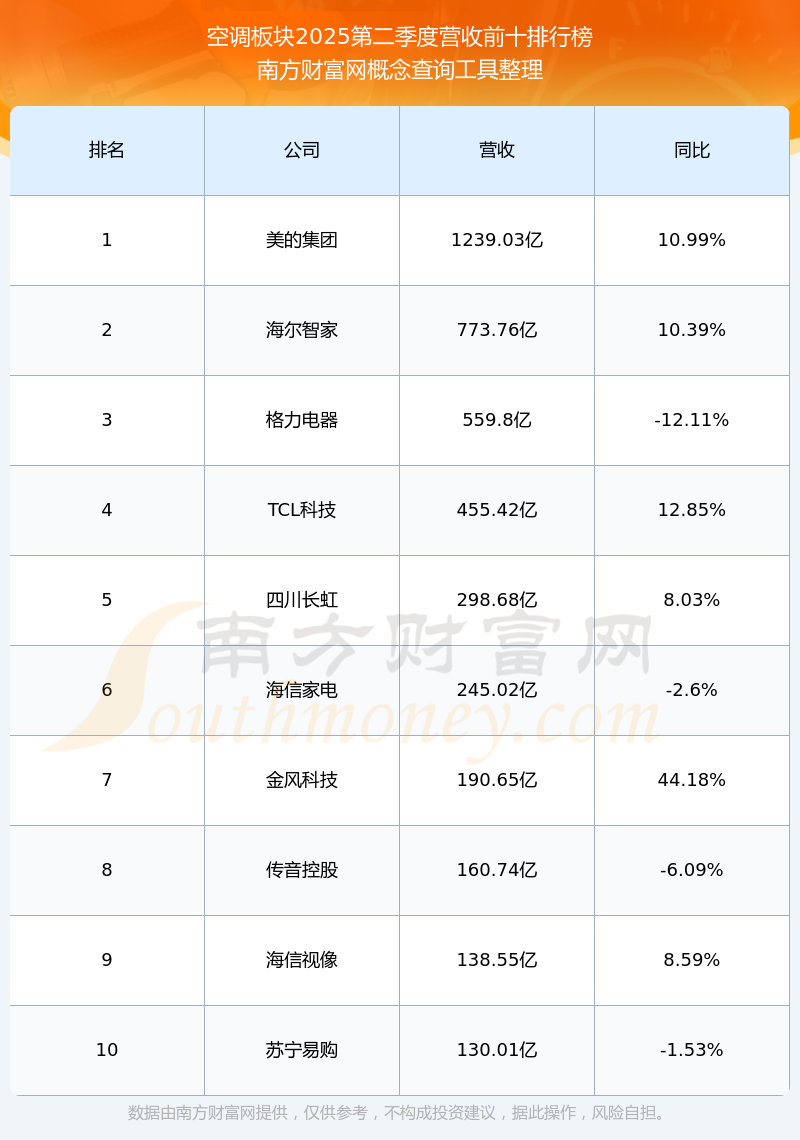 按照南方財(cái)富網(wǎng)概念查詢工具統(tǒng)計(jì),該股所屬板塊為空調(diào)板塊,該板塊共有85只股票,四川長虹2025第二季度營收在該板塊中排名為第5名,該板塊2025第二季度營收排名前十的股票如下表: