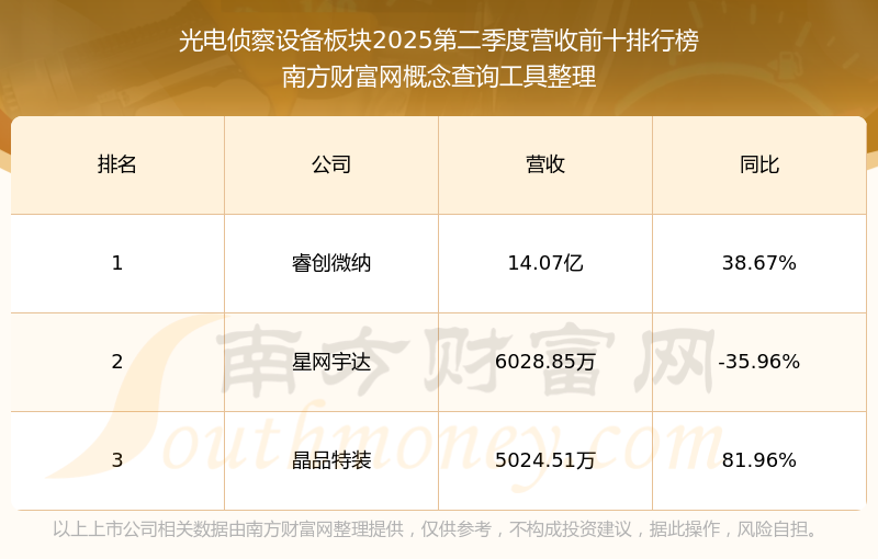 按照南方財富網(wǎng)概念查詢工具統(tǒng)計,該股所屬板塊為光電偵察設(shè)備板塊,該板塊共有3只股票,晶品特裝2025第二季度營收在該板塊中排名為第3名,該板塊2025第二季度營收排名前十的股票如下表: