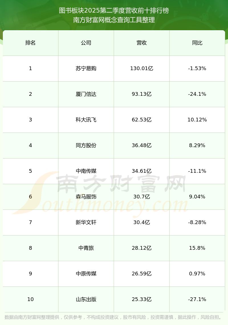 按照南方財富網(wǎng)概念查詢工具統(tǒng)計,該股所屬板塊為圖書板塊,該板塊共有62只股票,龍版?zhèn)髅?025第二季度營收在該板塊中排名為第53名,該板塊2025第二季度營收排名前十的股票如下表: