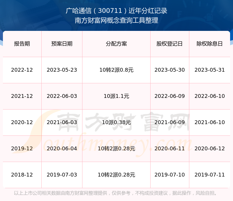 廣哈通信最新一次公布的分紅方案:10轉(zhuǎn)2派0.8元。