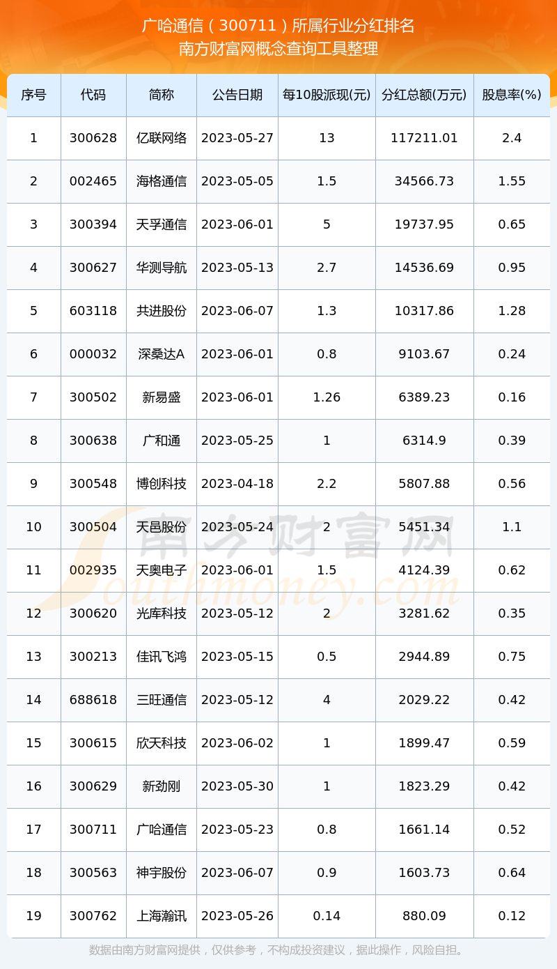 按照南方財(cái)富網(wǎng)趨勢選股系統(tǒng)統(tǒng)計(jì),廣哈通信所屬行業(yè)為通信設(shè)備行業(yè),通信設(shè)備行業(yè)分紅排名情況如下表: