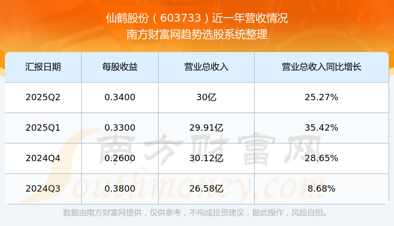 仙鶴股份(603733)披露2025年第二季度報(bào)告,報(bào)告期實(shí)現(xiàn)營(yíng)收30億元,同比25.27%;歸母凈利潤(rùn)2.38億元,同比-15.39%;扣非凈利潤(rùn)2.19億元,同比-16.38%。