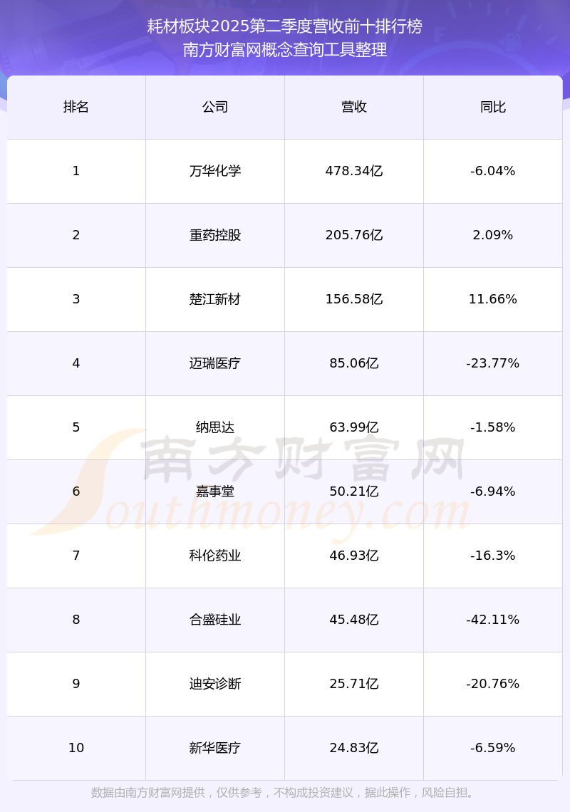 按照南方財(cái)富網(wǎng)概念查詢工具統(tǒng)計(jì),該股所屬板塊為耗材板塊,該板塊共有65只股票,賽科希德2025第二季度營(yíng)收在該板塊中排名為第65名,該板塊2025第二季度營(yíng)收排名前十的股票如下表:
