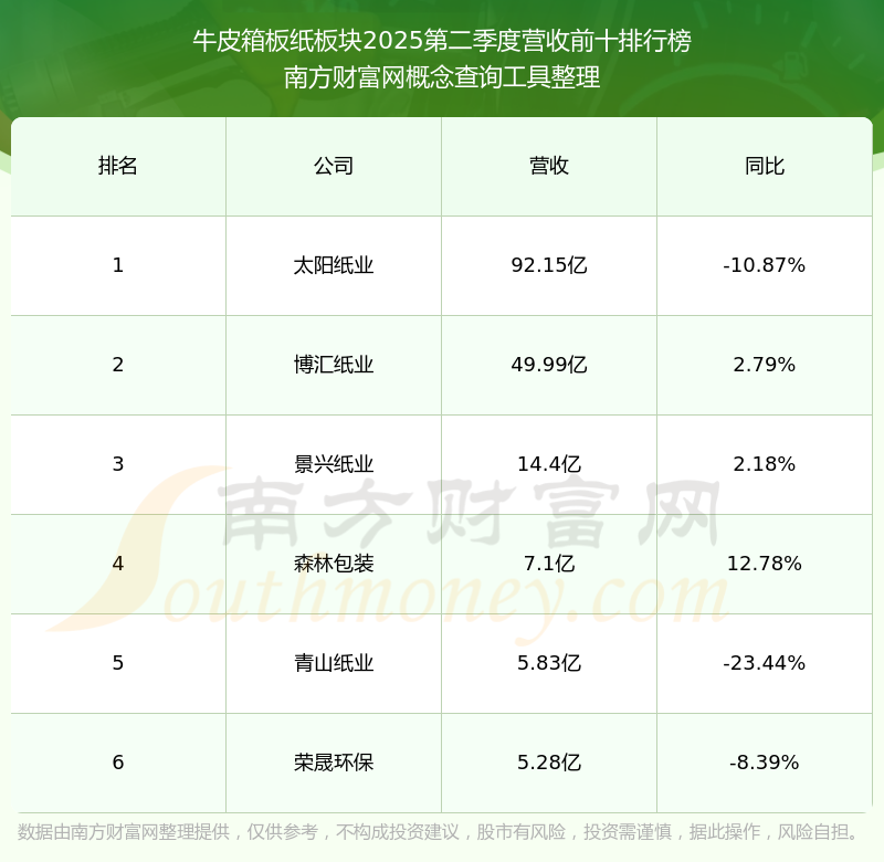 按照南方財(cái)富網(wǎng)概念查詢工具統(tǒng)計(jì),該股所屬板塊為牛皮箱板紙板塊,該板塊共有6只股票,森林包裝2025第二季度營收在該板塊中排名為第4名,該板塊2025第二季度營收排名前十的股票如下表: