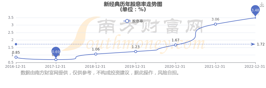 近年新經(jīng)典年度股息率走勢如下圖: