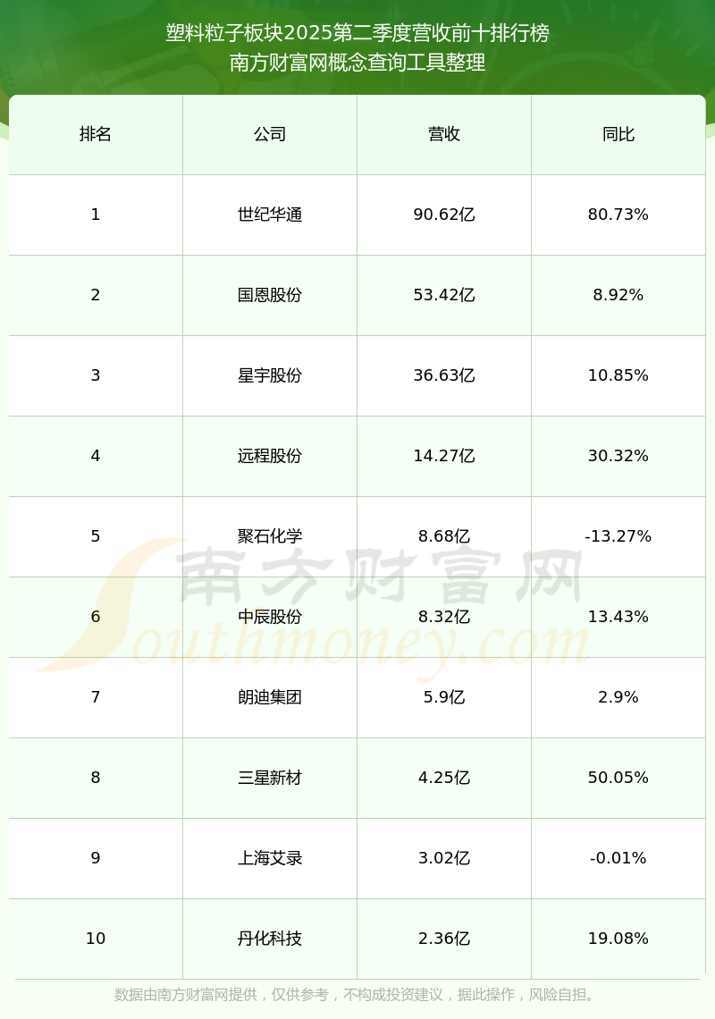 按照南方財富網(wǎng)概念查詢工具統(tǒng)計,該股所屬板塊為塑料粒子板塊,該板塊共有11只股票,上?萍2025第二季度營收在該板塊中排名為第11名,該板塊2025第二季度營收排名前十的股票如下表: