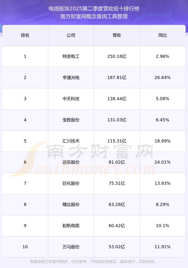 按照南方財(cái)富網(wǎng)概念查詢工具統(tǒng)計(jì),該股所屬板塊為電線板塊,該板塊共有50只股票,華通線纜2025第二季度營收在該板塊中排名為第21名,該板塊2025第二季度營收排名前十的股票如下表: