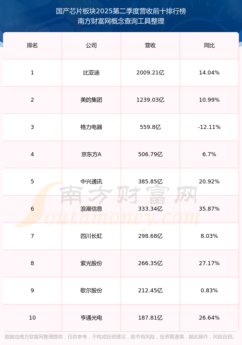 按照南方財(cái)富網(wǎng)概念查詢(xún)工具統(tǒng)計(jì),該股所屬板塊為國(guó)產(chǎn)芯片板塊,該板塊共有391只股票,立霸股份2025第二季度營(yíng)收在該板塊中排名為第222名,該板塊2025第二季度營(yíng)收排名前十的股票如下表: