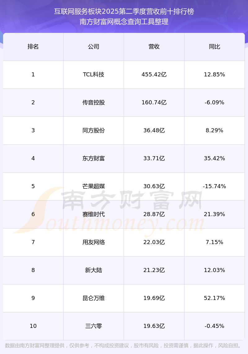 按照南方財(cái)富網(wǎng)概念查詢(xún)工具統(tǒng)計(jì),該股所屬板塊為互聯(lián)網(wǎng)服務(wù)板塊,該板塊共有52只股票,返利科技2025第二季度營(yíng)收在該板塊中排名為第52名,該板塊2025第二季度營(yíng)收排名前十的股票如下表: