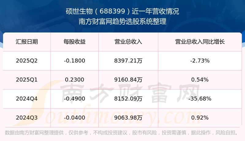 碩世生物2025年第二季度財報顯示,公司主營收入8397.21萬元,同比-2.73%;歸母凈利潤-882.68萬元,同比18.48%;扣非凈利潤-2246.73萬元,同比-32.17%;