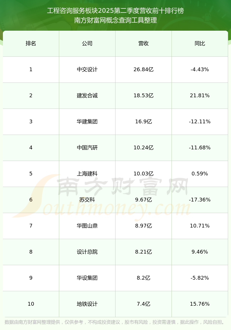 按照南方財富網(wǎng)概念查詢工具統(tǒng)計(jì),該股所屬板塊為工程咨詢服務(wù)板塊,該板塊共有39只股票,建發(fā)合誠2025第二季度營收在該板塊中排名為第2名,該板塊2025第二季度營收排名前十的股票如下表: