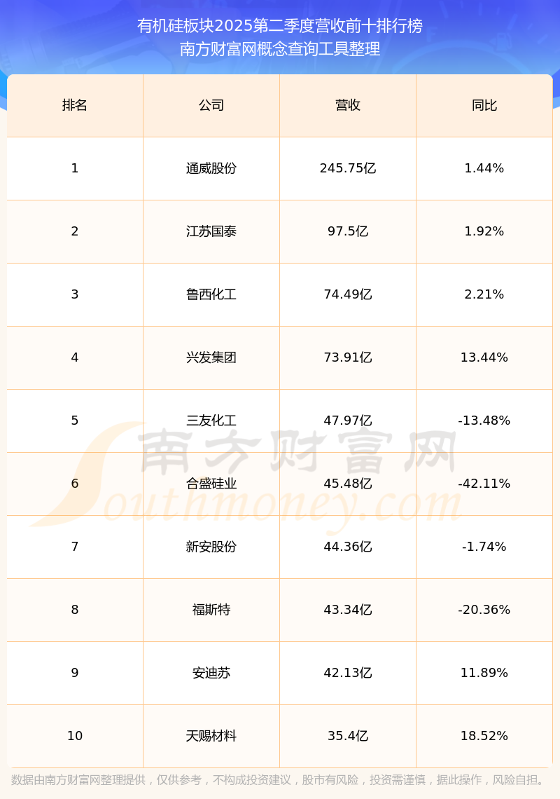 按照南方財(cái)富網(wǎng)概念查詢(xún)工具統(tǒng)計(jì),該股所屬板塊為有機(jī)硅板塊,該板塊共有49只股票,三孚股份2025第二季度營(yíng)收在該板塊中排名為第21名,該板塊2025第二季度營(yíng)收排名前十的股票如下表: