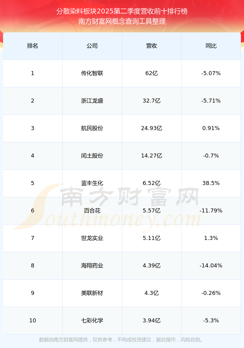 按照南方財(cái)富網(wǎng)概念查詢工具統(tǒng)計(jì),該股所屬板塊為分散染料板塊,該板塊共有23只股票,萬(wàn)豐股份2025第二季度營(yíng)收在該板塊中排名為第21名,該板塊2025第二季度營(yíng)收排名前十的股票如下表: