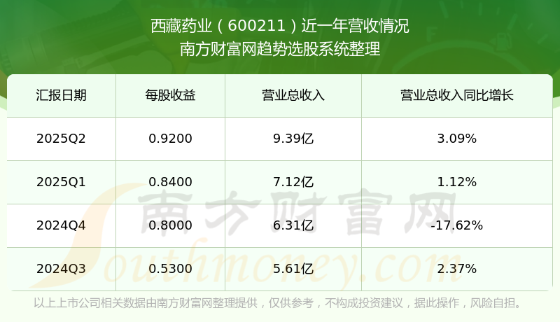 西藏藥業(yè)2025年第二季度財(cái)報(bào)顯示,公司主營(yíng)收入9.39億元,同比3.09%;歸母凈利潤(rùn)2.98億元,同比-3.92%;扣非凈利潤(rùn)2.89億元,同比0.27%;