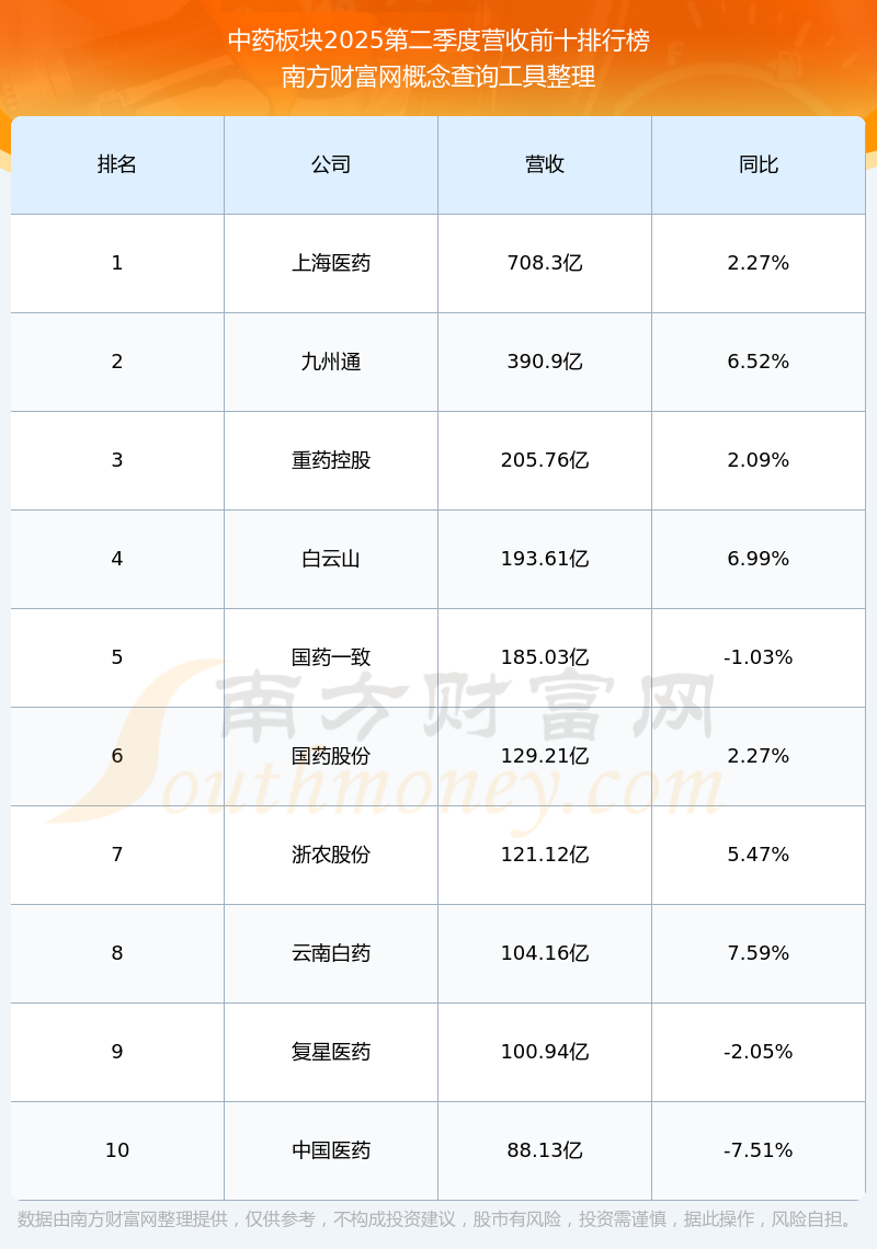 按照南方財(cái)富網(wǎng)概念查詢工具統(tǒng)計(jì),該股所屬板塊為中藥板塊,該板塊共有161只股票,西藏藥業(yè)2025第二季度營(yíng)收在該板塊中排名為第56名,該板塊2025第二季度營(yíng)收排名前十的股票如下表: