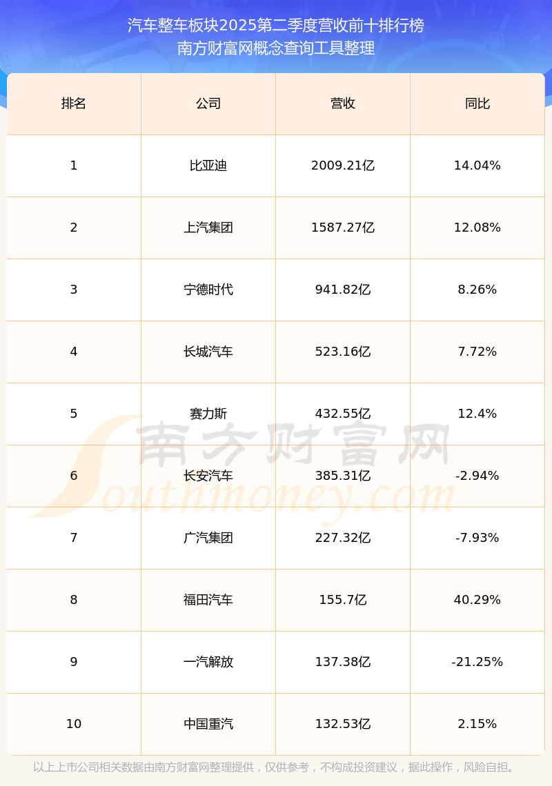 按照南方財(cái)富網(wǎng)概念查詢工具統(tǒng)計(jì),該股所屬板塊為汽車整車板塊,該板塊共有45只股票,千里科技2025第二季度營收在該板塊中排名為第23名,該板塊2025第二季度營收排名前十的股票如下表: