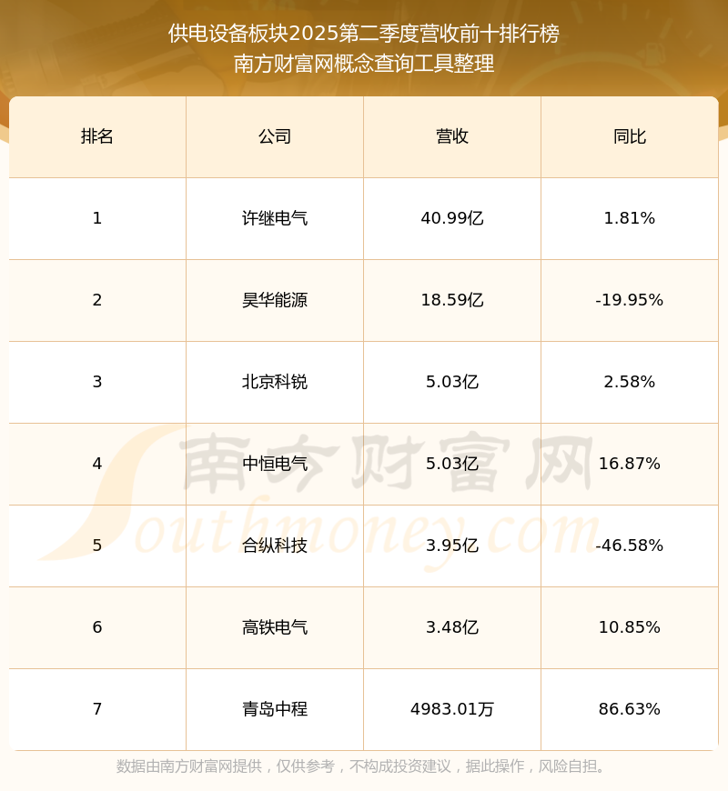 按照南方財(cái)富網(wǎng)概念查詢工具統(tǒng)計(jì),該股所屬板塊為供電設(shè)備板塊,該板塊共有7只股票,高鐵電氣2025第二季度營(yíng)收在該板塊中排名為第6名,該板塊2025第二季度營(yíng)收排名前十的股票如下表: