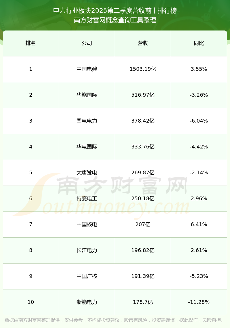 按照南方財(cái)富網(wǎng)概念查詢工具統(tǒng)計(jì),該股所屬板塊為電力行業(yè)板塊,該板塊共有93只股票,西昌電力2025第二季度營(yíng)收在該板塊中排名為第76名,該板塊2025第二季度營(yíng)收排名前十的股票如下表: