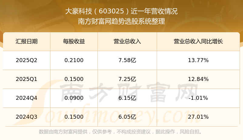 大豪科技2025年第二季度顯示,公司主營(yíng)收入7.58億元,同比13.77%;歸母凈利潤(rùn)2.3億元,同比33.13%;扣非凈利潤(rùn)2.27億元,同比27.6%。