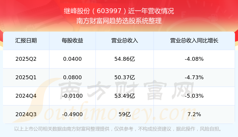 繼峰股份2025年第二季度財(cái)報(bào)顯示,公司主營(yíng)收入54.86億元,同比-4.08%;歸母凈利潤(rùn)4942.2萬元,同比45.06%;扣非凈利潤(rùn)1億元,同比808.46%;
