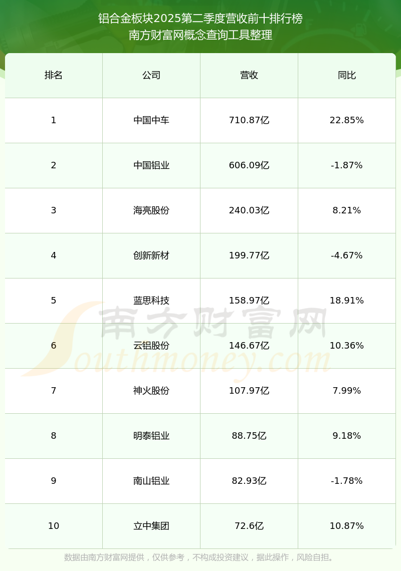 按照南方財富網概念查詢工具統(tǒng)計,該股所屬板塊為鋁合金板塊,該板塊共有71只股票,豐華股份2025第二季度營收在該板塊中排名為第69名,該板塊2025第二季度營收排名前十的股票如下表: