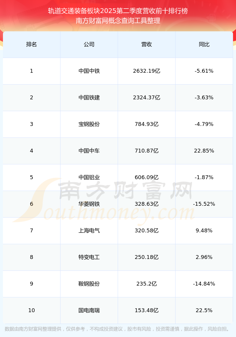 按照南方財(cái)富網(wǎng)概念查詢工具統(tǒng)計(jì),該股所屬板塊為軌道交通裝備板塊,該板塊共有78只股票,時(shí)代電氣2025第二季度營(yíng)收在該板塊中排名為第15名,該板塊2025第二季度營(yíng)收排名前十的股票如下表: