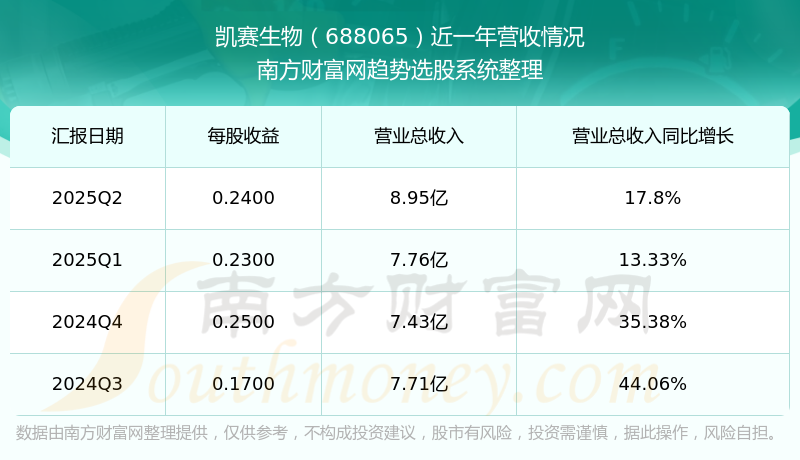 凱賽生物(688065)發(fā)布2025年第二季度財報。2025年第二季度凱賽生物實現(xiàn)營業(yè)收入8.95億元,同比增加17.8元%,環(huán)比增加15.37%;凈利潤為1.72億元,同比增長20.77%,環(huán)比增長25.39%。