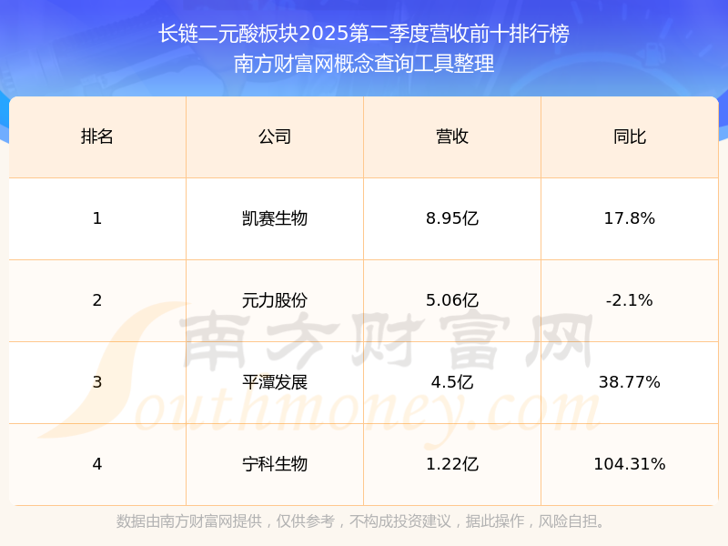 按照南方財富網(wǎng)概念查詢工具統(tǒng)計,該股所屬板塊為長鏈二元酸板塊,該板塊共有4只股票,凱賽生物2025第二季度營收在該板塊中排名為第1名,該板塊2025第二季度營收排名前十的股票如下表: