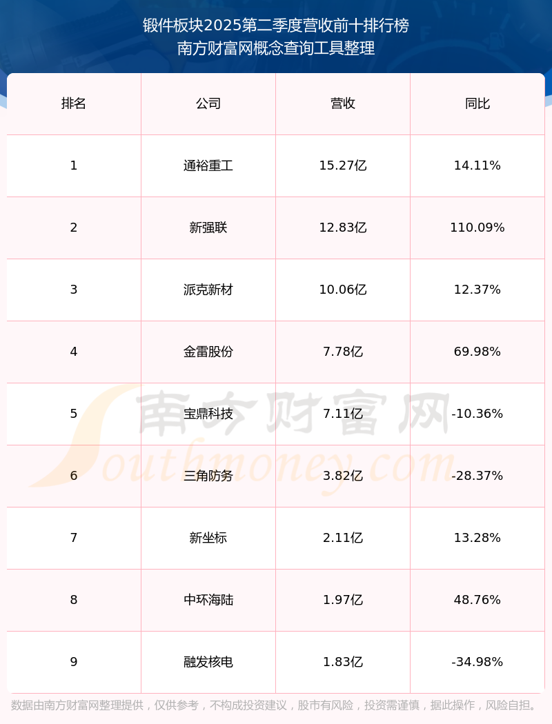 按照南方財(cái)富網(wǎng)概念查詢(xún)工具統(tǒng)計(jì),該股所屬板塊為鍛件板塊,該板塊共有9只股票,航宇科技2025第二季度營(yíng)收在該板塊中排名為第9名,該板塊2025第二季度營(yíng)收排名前十的股票如下表: