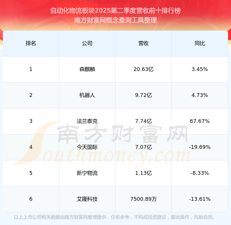 按照南方財富網(wǎng)概念查詢工具統(tǒng)計,該股所屬板塊為自動化物流板塊,該板塊共有6只股票,德馬科技2025第二季度營收在該板塊中排名為第6名,該板塊2025第二季度營收排名前十的股票如下表: