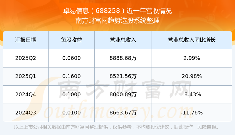 卓易信息(688258)披露2025年第二季度報告,報告期實現(xiàn)營收8888.68萬元,同比2.99%;歸母凈利潤832.68萬元,同比252.71%;扣非凈利潤396.82萬元,同比61.82%;基本每股收益0.06元。
