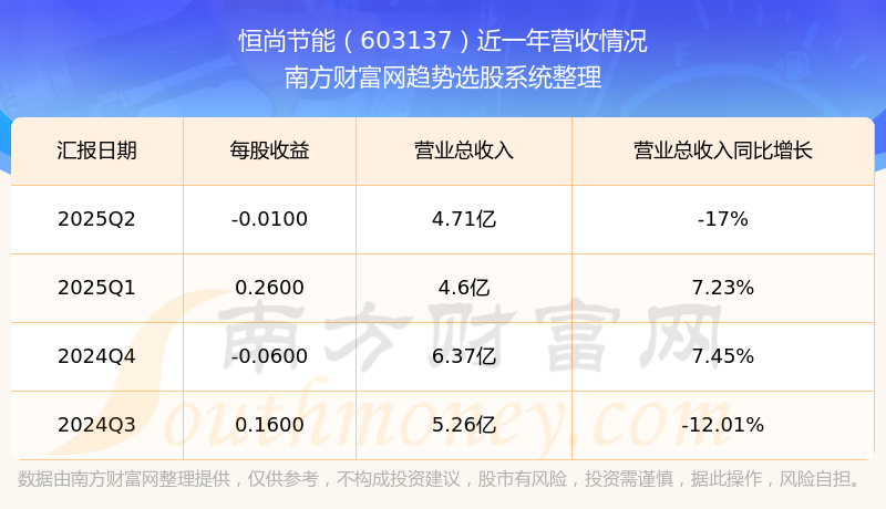 在2025年第二季度,恒尚節(jié)能的業(yè)績表現(xiàn),主營業(yè)務(wù)收入達到4.71億元,實現(xiàn)了-17%的同比增長率。同時,公司歸母凈利潤錄得-212.24萬元,同比增長-112.72%。