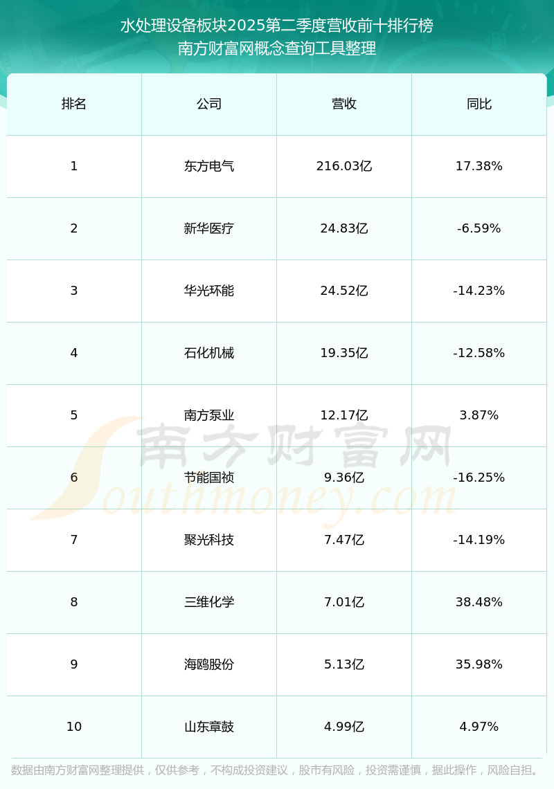 按照南方財(cái)富網(wǎng)概念查詢工具統(tǒng)計(jì),該股所屬板塊為水處理設(shè)備板塊,該板塊共有20只股票,力源科技2025第二季度營(yíng)收在該板塊中排名為第20名,該板塊2025第二季度營(yíng)收排名前十的股票如下表: