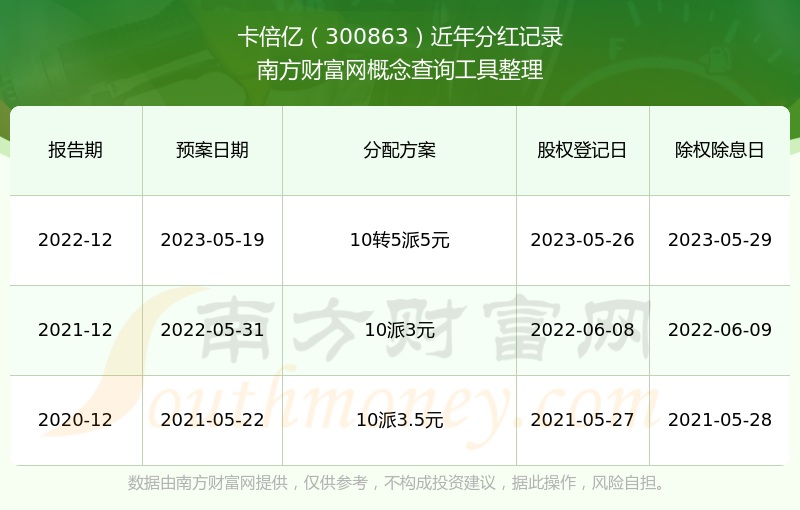 卡倍億最新一次公布的分紅方案為10轉(zhuǎn)5派5元。本次權(quán)益分派股權(quán)登記日為2023年5月26日,除權(quán)除息日為2023年5月29日,派息日為2023年5月29日。