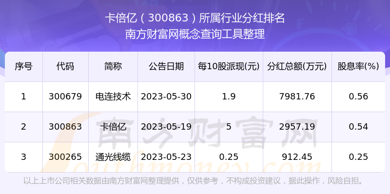 按照南方財富網(wǎng)趨勢選股系統(tǒng)統(tǒng)計,卡倍億所屬行業(yè)為線纜行業(yè),線纜行業(yè)分紅排名情況如下表: