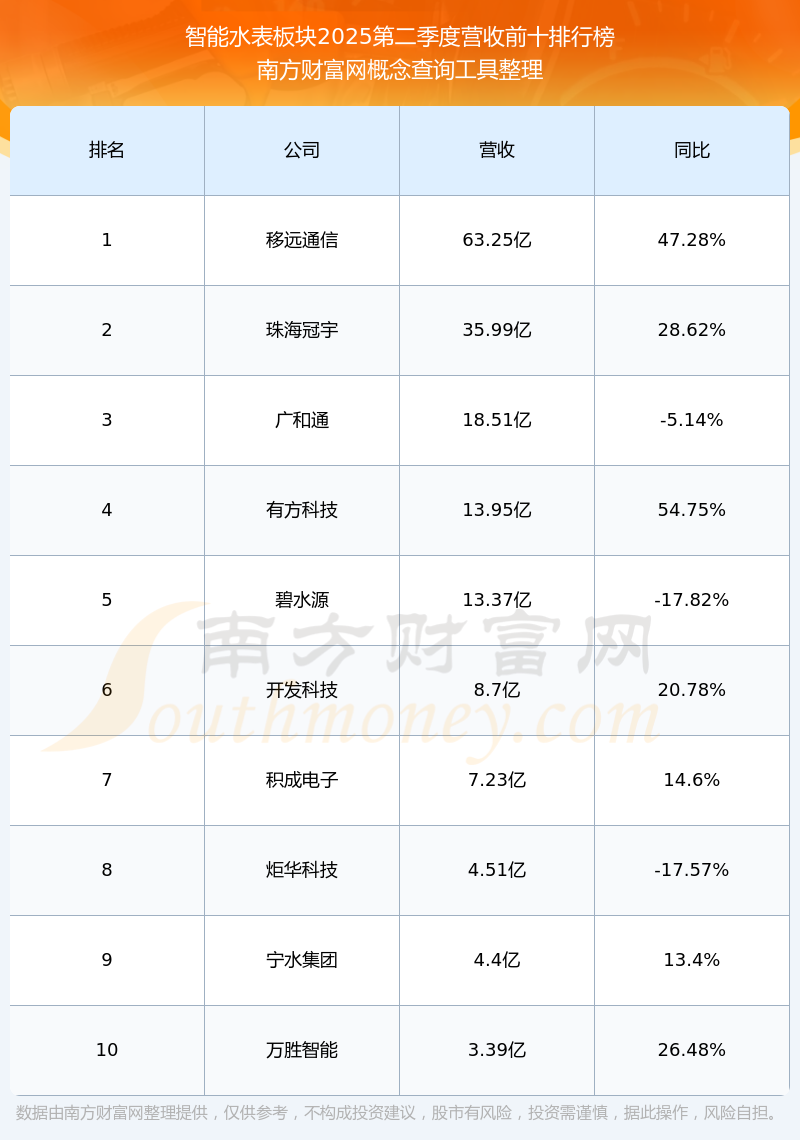 按照南方財(cái)富網(wǎng)概念查詢工具統(tǒng)計(jì),該股所屬板塊為智能水表板塊,該板塊共有15只股票,寧水集團(tuán)2025第二季度營(yíng)收在該板塊中排名為第9名,該板塊2025第二季度營(yíng)收排名前十的股票如下表: