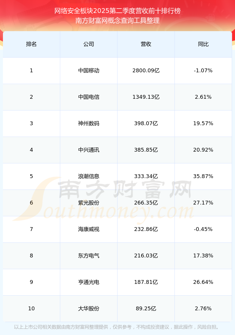 按照南方財(cái)富網(wǎng)概念查詢(xún)工具統(tǒng)計(jì),該股所屬板塊為網(wǎng)絡(luò)安全板塊,該板塊共有179只股票,亞信安全2025第二季度營(yíng)收在該板塊中排名為第30名,該板塊2025第二季度營(yíng)收排名前十的股票如下表: