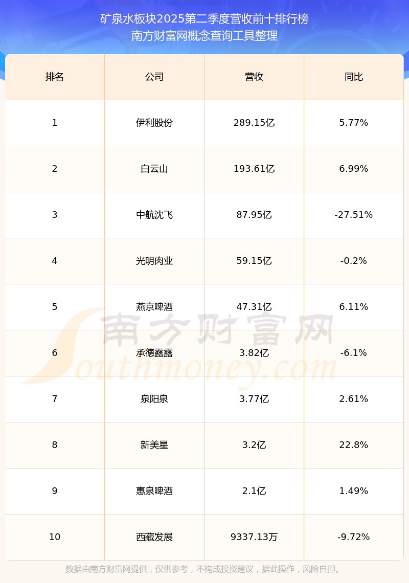 按照南方財富網(wǎng)概念查詢工具統(tǒng)計,該股所屬板塊為礦泉水板塊,該板塊共有11只股票,泉陽泉2025第二季度營收在該板塊中排名為第7名,該板塊2025第二季度營收排名前十的股票如下表: