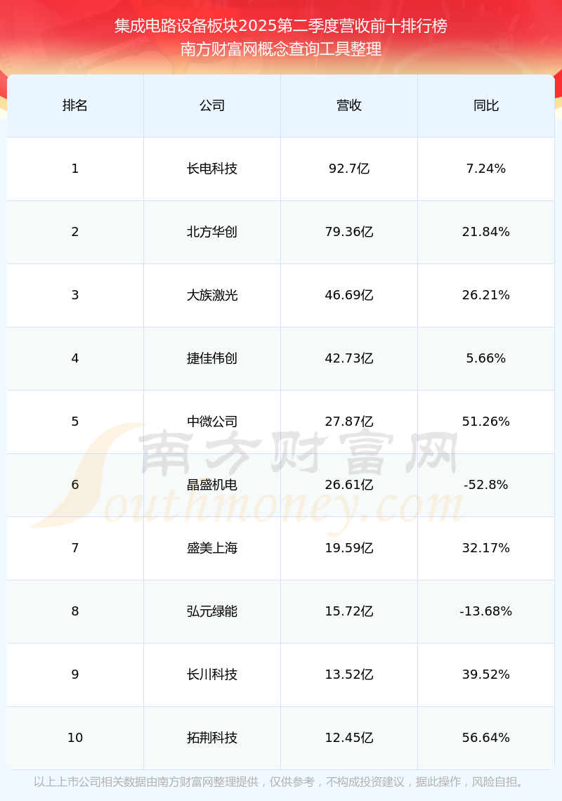 按照南方財(cái)富網(wǎng)概念查詢工具統(tǒng)計(jì),該股所屬板塊為集成電路設(shè)備板塊,該板塊共有25只股票,中微公司2025第二季度營(yíng)收在該板塊中排名為第5名,該板塊2025第二季度營(yíng)收排名前十的股票如下表: