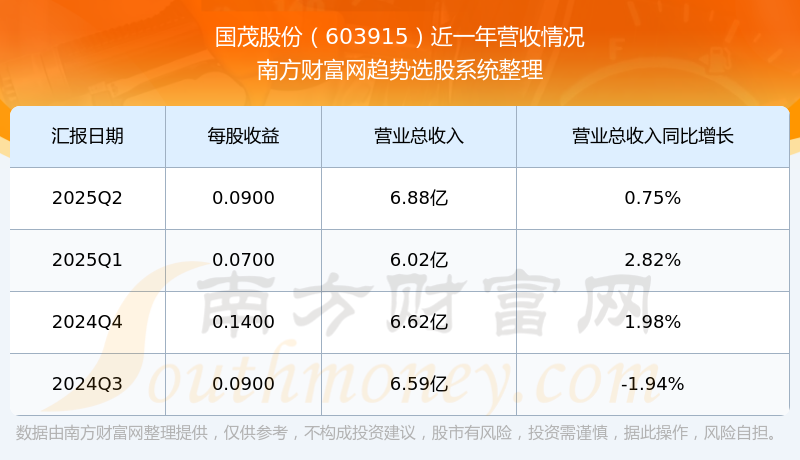 國茂股份2025年第二季度財報顯示,公司主營收入6.88億元,同比0.75%;歸母凈利潤6380.83萬元,同比-21.86%;扣非凈利潤5537.68萬元,同比-15.32%;