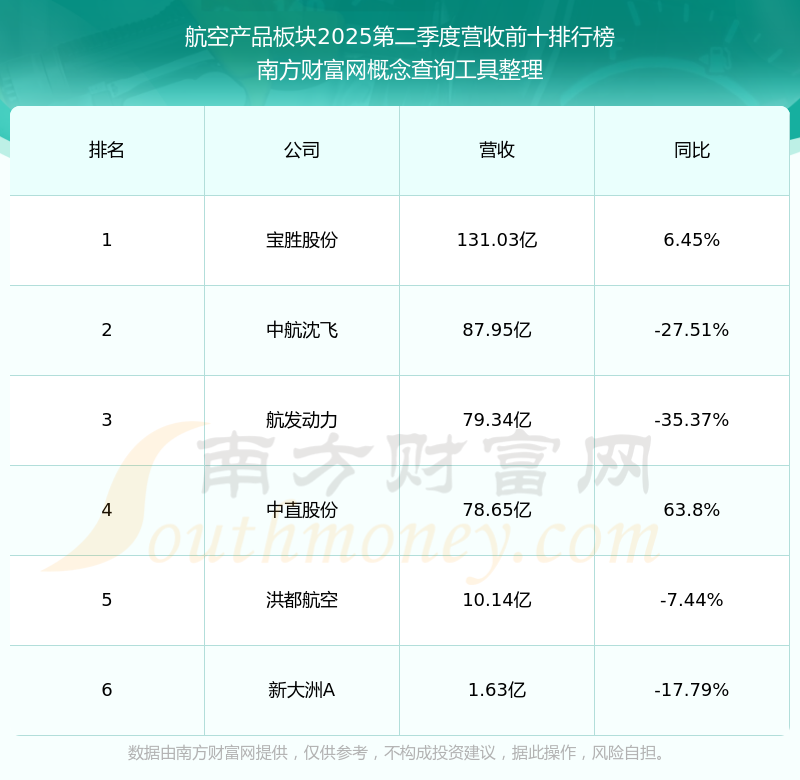 按照南方財富網(wǎng)概念查詢工具統(tǒng)計,該股所屬板塊為航空產(chǎn)品板塊,該板塊共有6只股票,中航沈飛2025第二季度營收在該板塊中排名為第2名,該板塊2025第二季度營收排名前十的股票如下表: