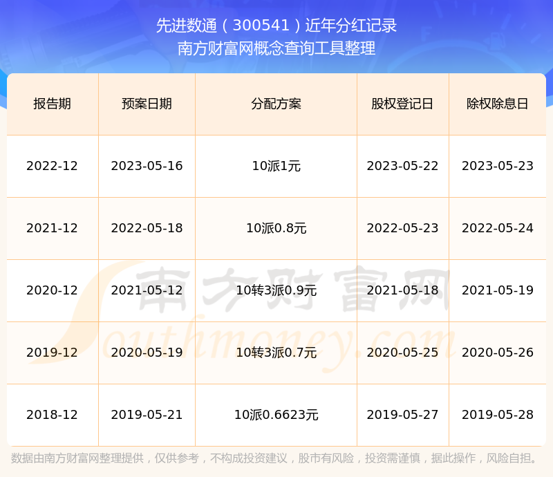 近年先進(jìn)數(shù)通分紅情況如下表所示: