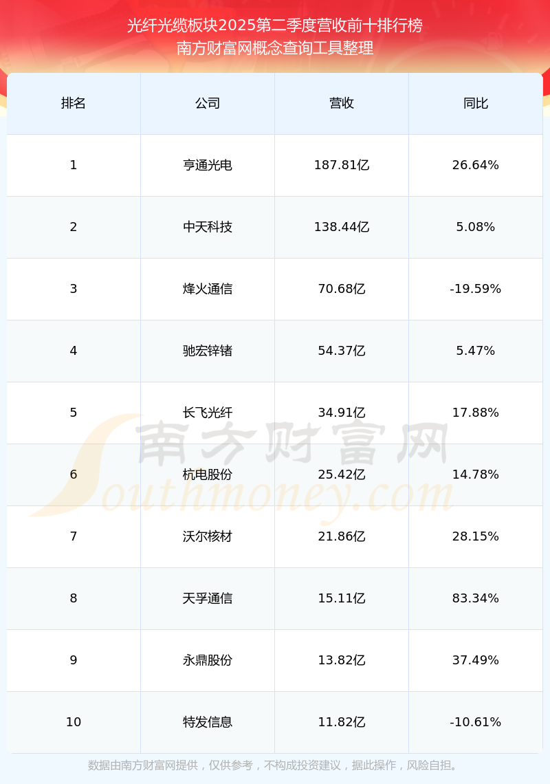 按照南方財(cái)富網(wǎng)概念查詢工具統(tǒng)計(jì),該股所屬板塊為光纖光纜板塊,該板塊共有41只股票,長飛光纖2025第二季度營收在該板塊中排名為第5名,該板塊2025第二季度營收排名前十的股票如下表: