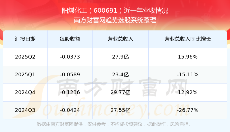陽(yáng)煤化工(600691)披露2025年第二季度報(bào)告,報(bào)告期實(shí)現(xiàn)營(yíng)收27.9億元,同比15.96%;歸母凈利潤(rùn)-8876.74萬(wàn)元,同比64.35%;扣非凈利潤(rùn)-8509.81萬(wàn)元,同比68.17%;基本每股收益-0.04元。