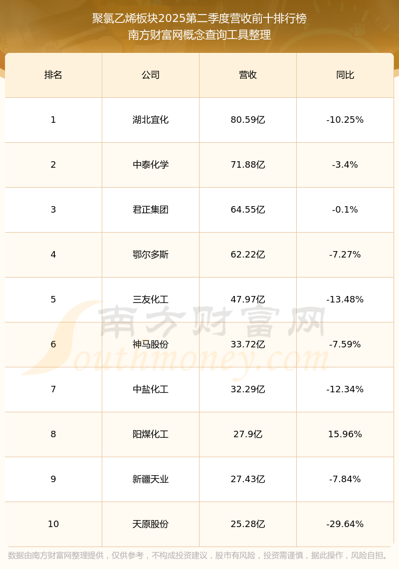 按照南方財(cái)富網(wǎng)概念查詢(xún)工具統(tǒng)計(jì),該股所屬板塊為聚氯乙烯板塊,該板塊共有21只股票,陽(yáng)煤化工2025第二季度營(yíng)收在該板塊中排名為第8名,該板塊2025第二季度營(yíng)收排名前十的股票如下表: