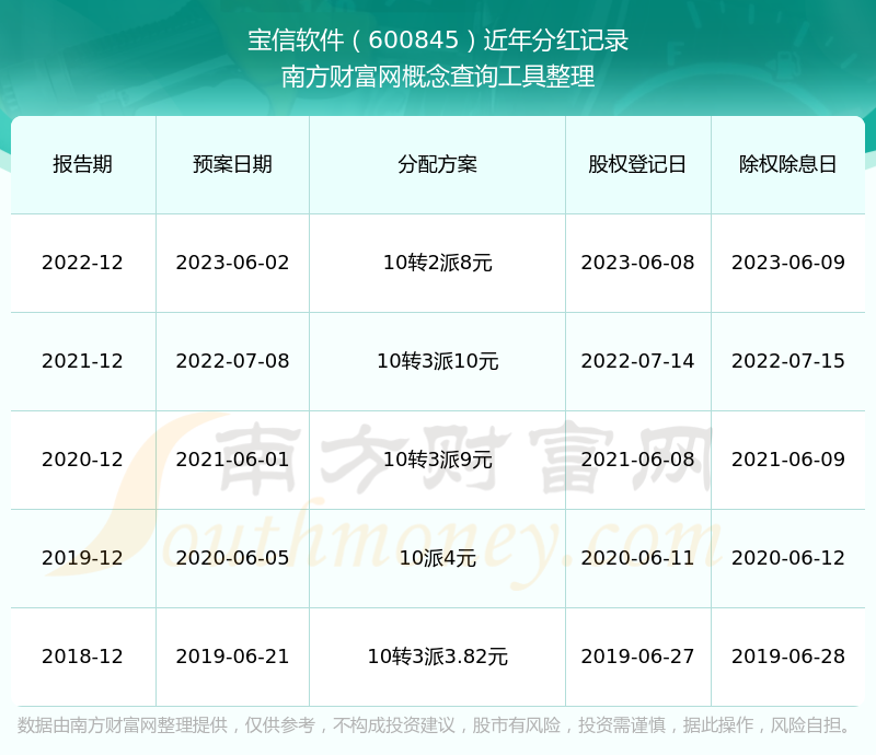 寶信軟件最新一次公布的分紅方案為10轉(zhuǎn)2派8元。本次權(quán)益分派股權(quán)登記日為2023年6月8日,除權(quán)除息日為2023年6月9日,派息日為2023年6月9日。