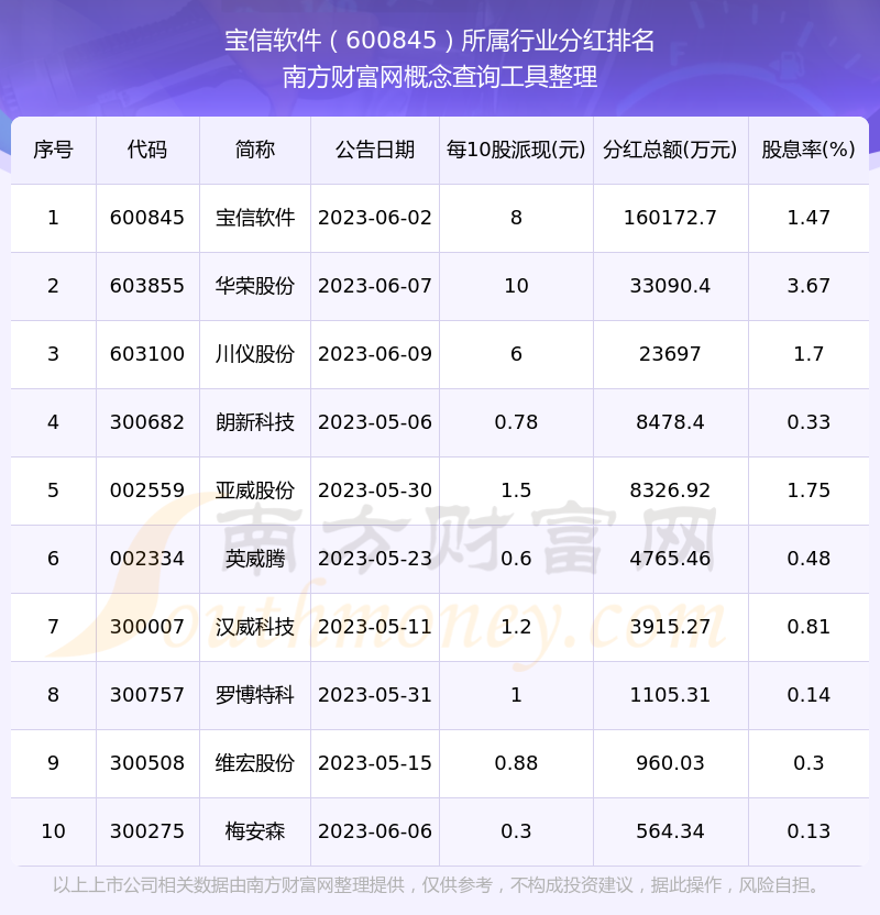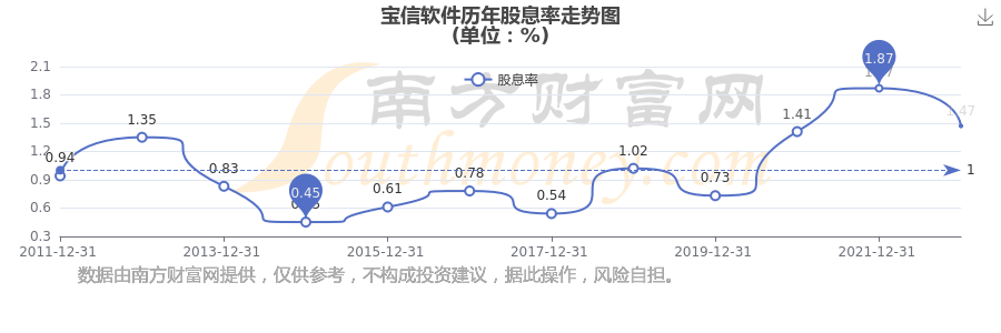 按照南方財富網(wǎng)趨勢選股系統(tǒng)統(tǒng)計,寶信軟件所屬行業(yè)為互聯(lián)網(wǎng)服務(wù)行業(yè),互聯(lián)網(wǎng)服務(wù)行業(yè)分紅排名情況如下表: