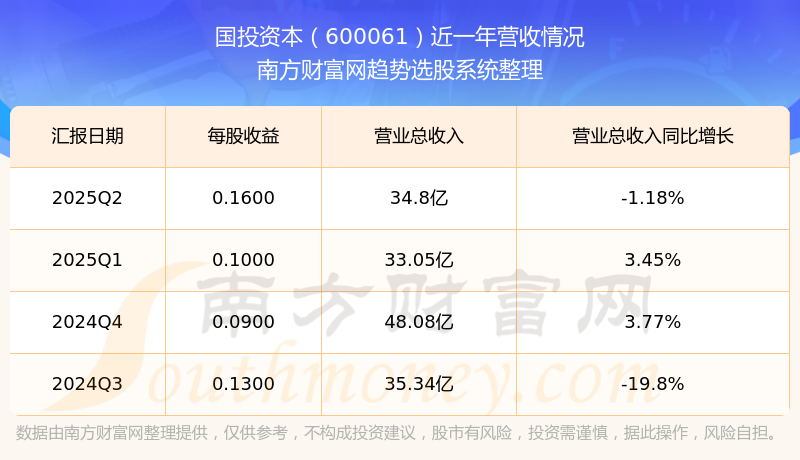 國(guó)投資本(600061)發(fā)布2025年第二季度財(cái)報(bào)。2025年第二季度國(guó)投資本實(shí)現(xiàn)營(yíng)業(yè)收入34.8億元,同比增加-1.18元%,環(huán)比增加5.3%;凈利潤(rùn)為10.21億元,同比增長(zhǎng)13.27%,環(huán)比增長(zhǎng)50.16%。