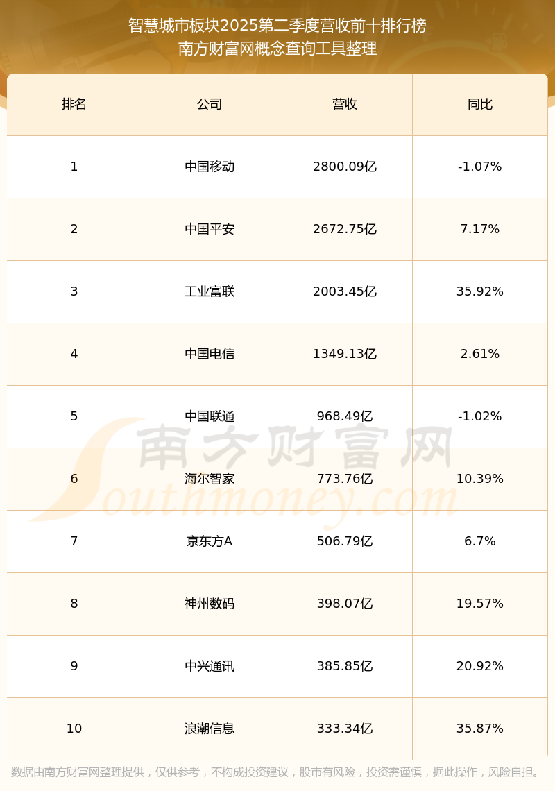 按照南方財富網(wǎng)概念查詢工具統(tǒng)計,該股所屬板塊為智慧城市板塊,該板塊共有346只股票,中貝通信2025第二季度營收在該板塊中排名為第346名,該板塊2025第二季度營收排名前十的股票如下表: