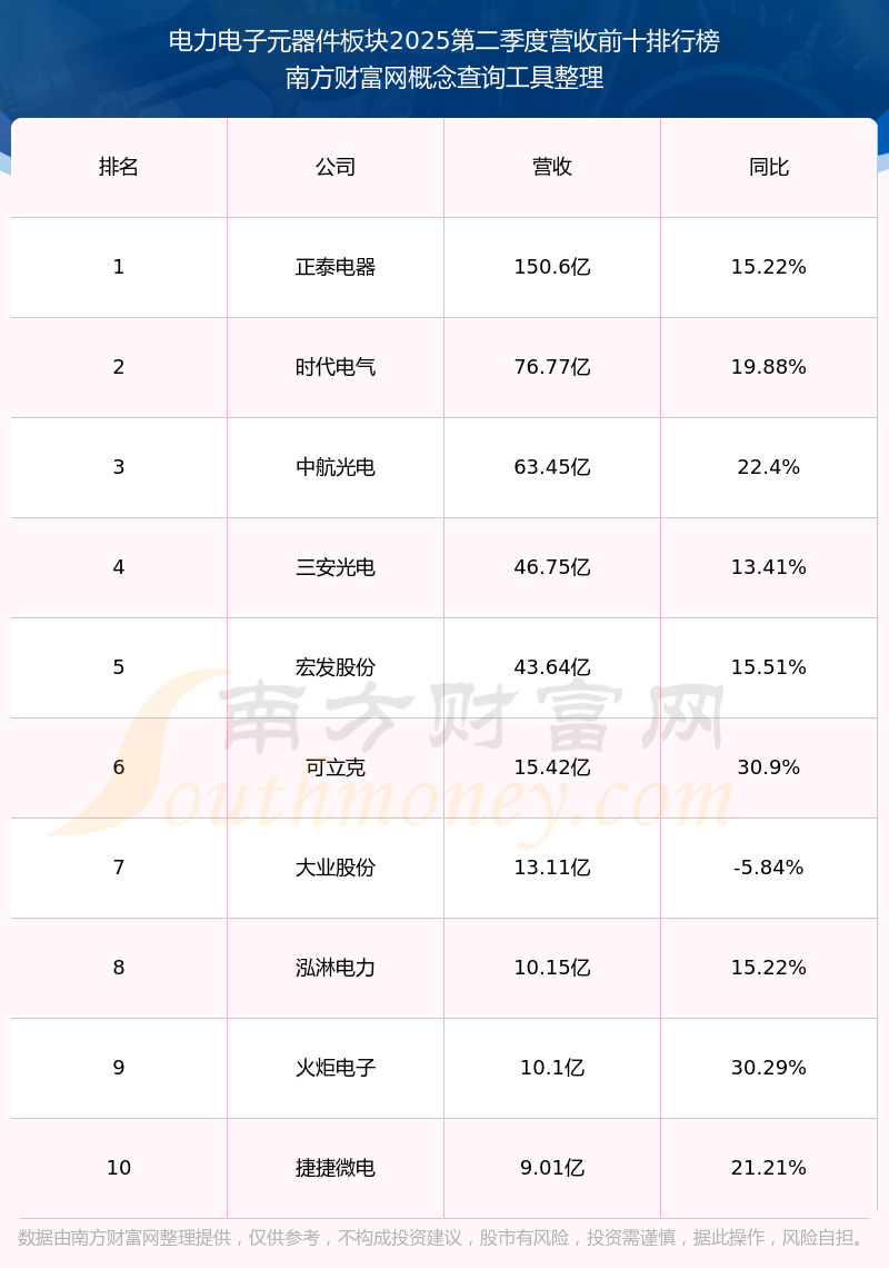 按照南方財富網(wǎng)概念查詢工具統(tǒng)計,該股所屬板塊為電力電子元器件板塊,該板塊共有32只股票,華豐科技2025第二季度營收在該板塊中排名為第32名,該板塊2025第二季度營收排名前十的股票如下表: